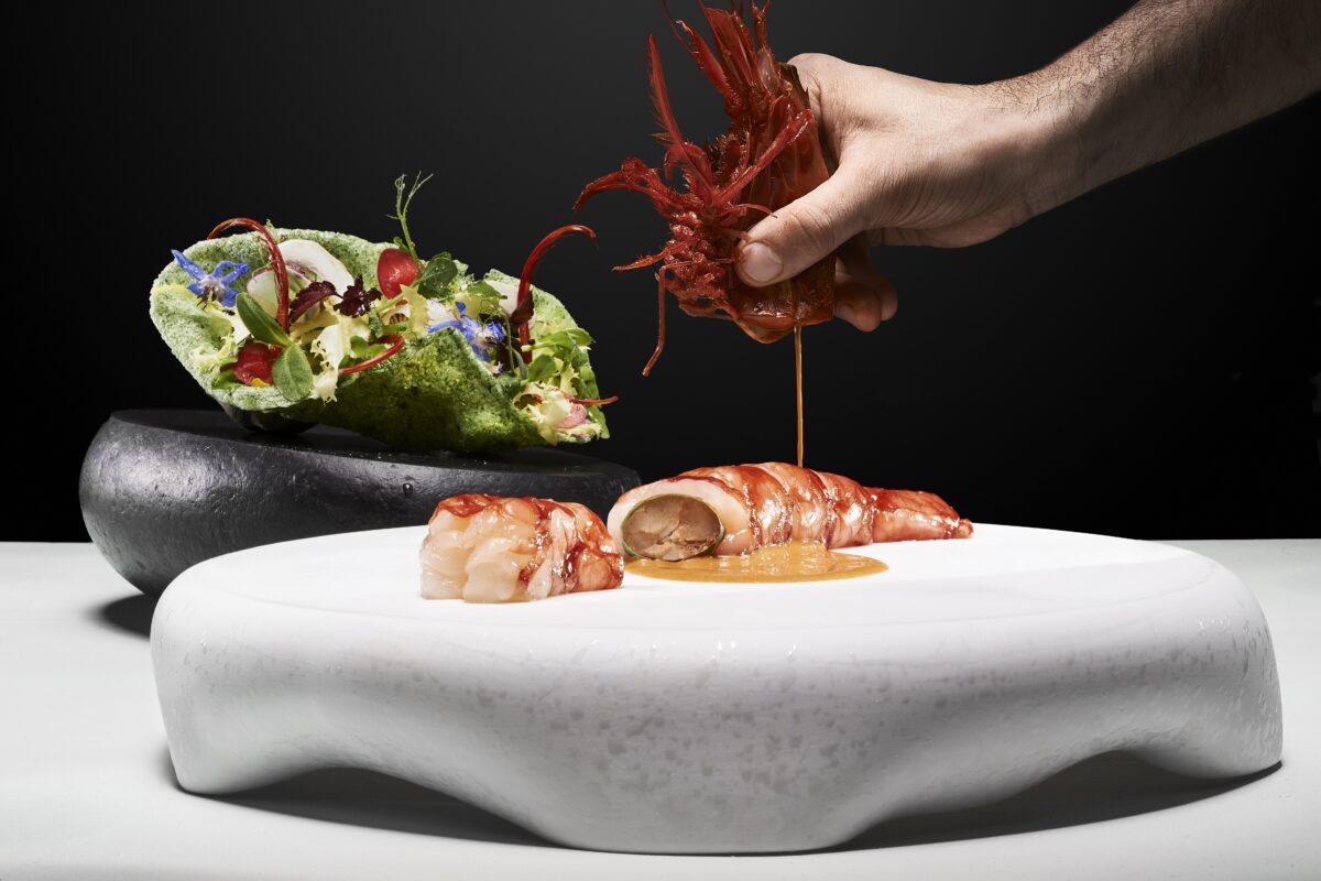 Signature dish:Gambero carabiniere, animelle glassate, croccante alle alghe con insalatina aromatica