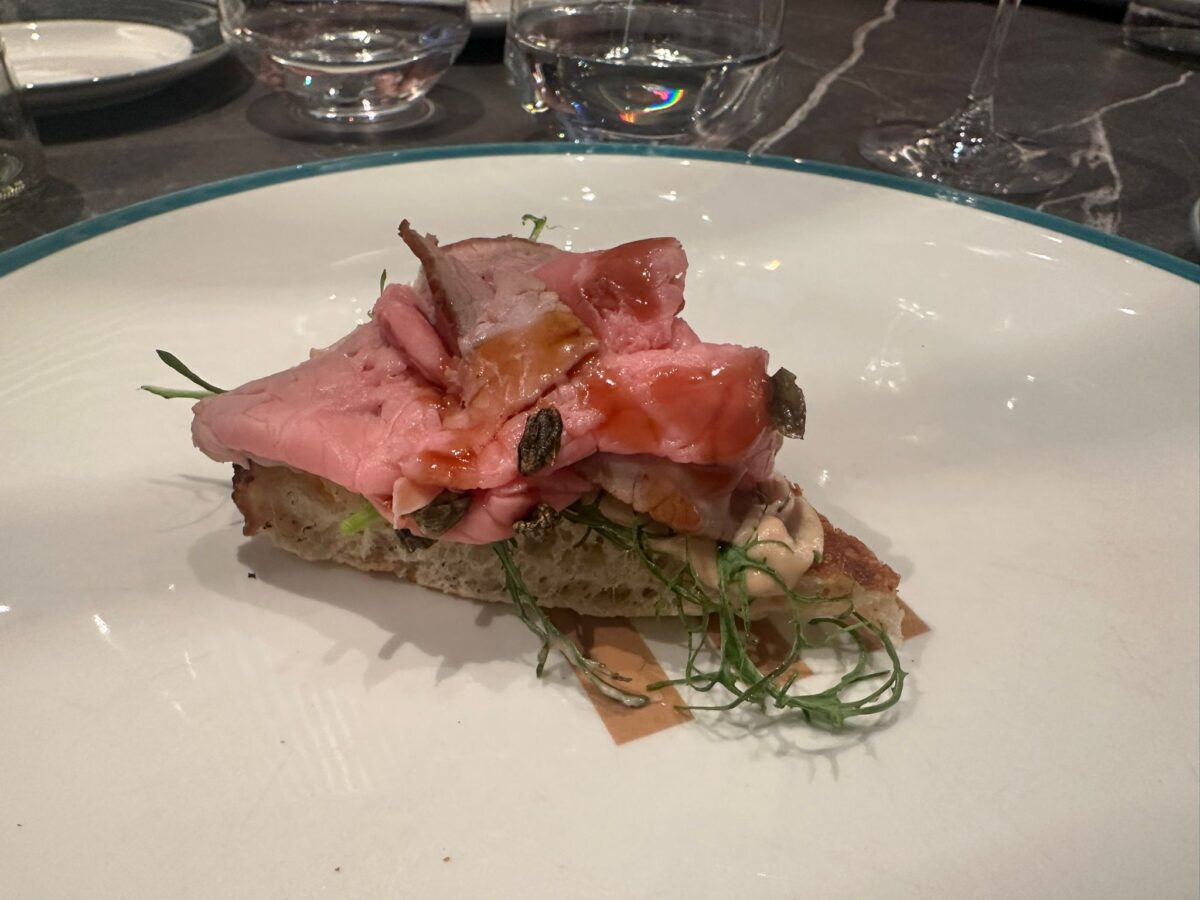 - La focaccia soffice con vitello tonnato impreziosita da Magatello di Fassona piemontese, capperi di Salina presidio Slow Food e fondo di vitello.